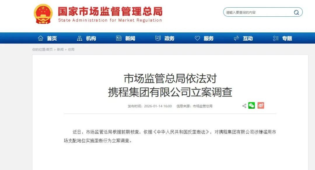 还没等贺双全把证据收集好提交给国家市监局,反垄断调查就启动了。2026年1月14日,国家市场监督管理总局依据《中华人民共和国反垄断法》(下称《反垄断法》),对携程集团有限公司涉嫌滥用市场支配地位实施垄断行为立案调查。看到这个消息,贺双全觉得“倍感欣慰”。